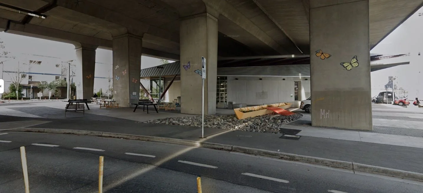 Map of Meeting Spot. Red Circle Text reads "MEET UNDER BRIDGE" and Red Arrow Text reads "TO SKYTRAIN & PARKING"